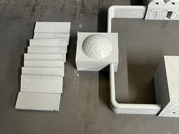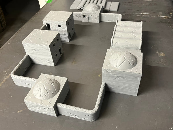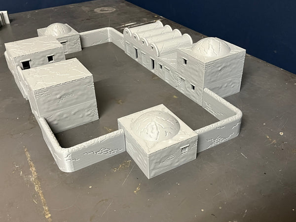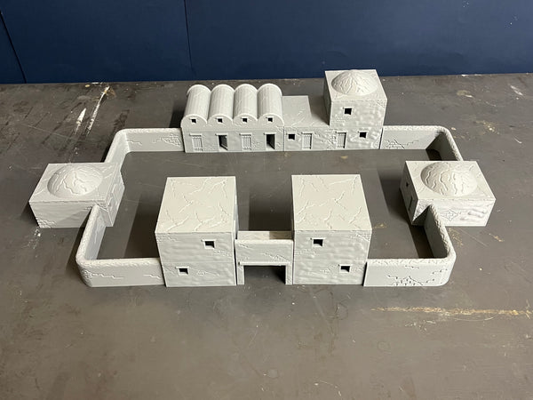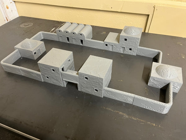 Modern-ish African warlord compound set. Just the thing to keep out the lions... and lawful government. Buildings all have a fully playable interior with separate floors and a removable roof. Walls are separate pieces which allows this set to be assembled in different configurations. Includes everything shown;, including the additional straight wall pieces to allow for additional configurations. Suitable for a wide variety of modern miniatures wargames.