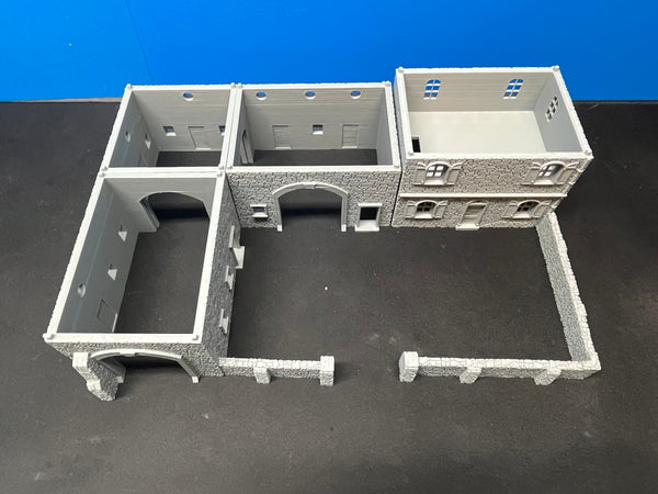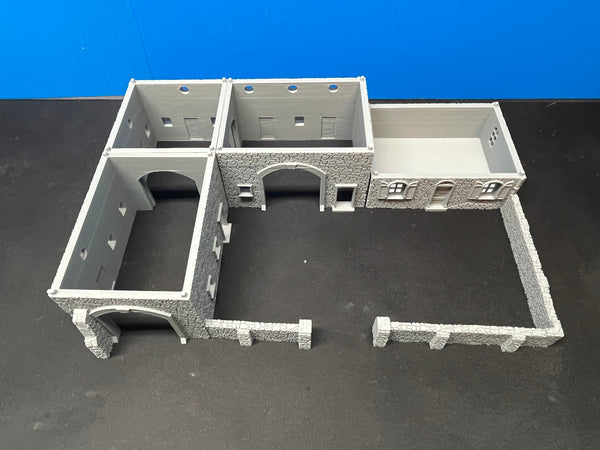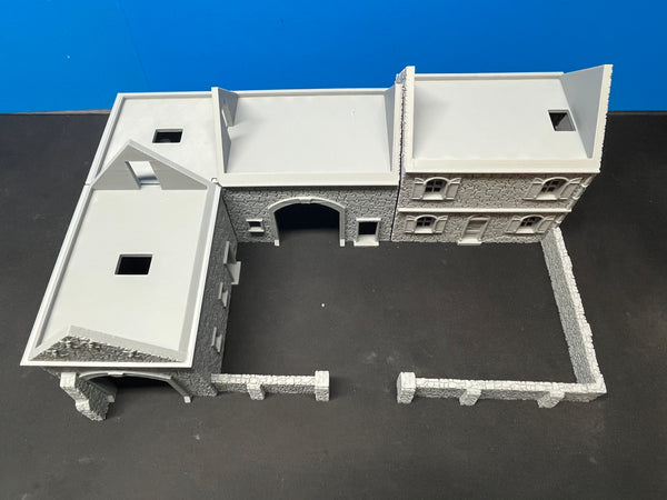 French or Western European style countryside L-Shaped Barn with Farmhouse. Fully playable interior with separate floors and removable roof; farmhouse is a separate building and does not have to be placed adjacent to the barn. Includes stone walls. Perfect for your WWII or early-mid century gaming table.